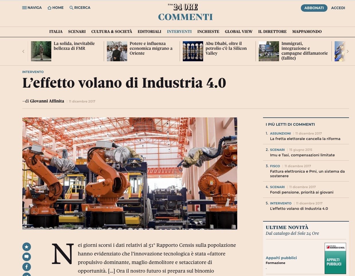 La rivoluzione Industria 4.0, l’articolo di commento di Giovanni Affinita su Il Sole 24 Ore